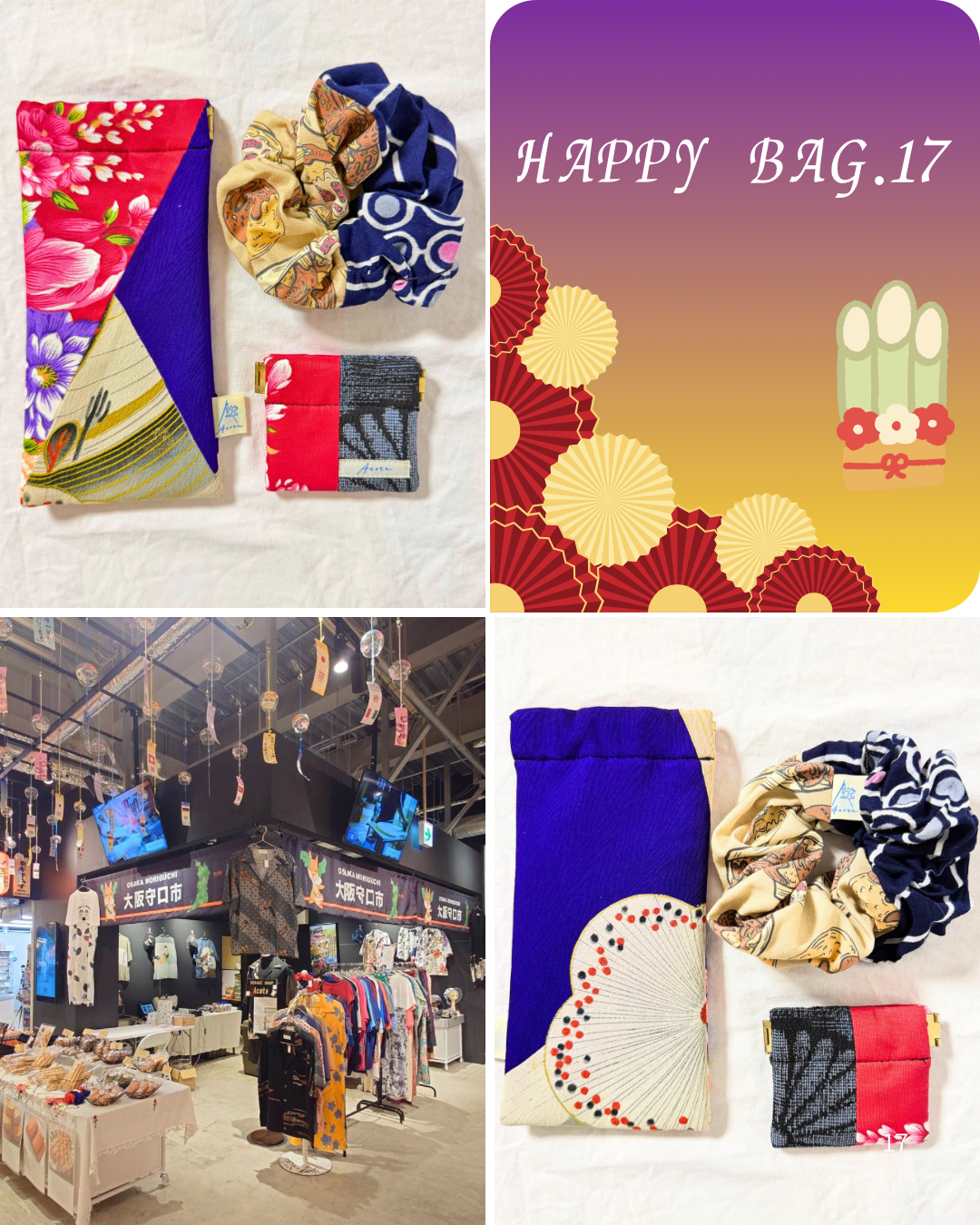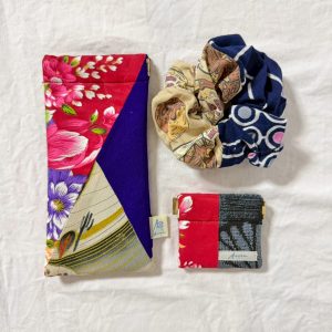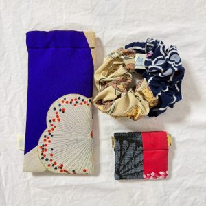 こちらの福袋の中身は、大阪関西万博で活躍した作品たちです。こちらは台湾の伝統柄と着物を合わせためがねケースとコインケース、たこ焼き柄と浴衣を合わせたシュシュの作品たちです。